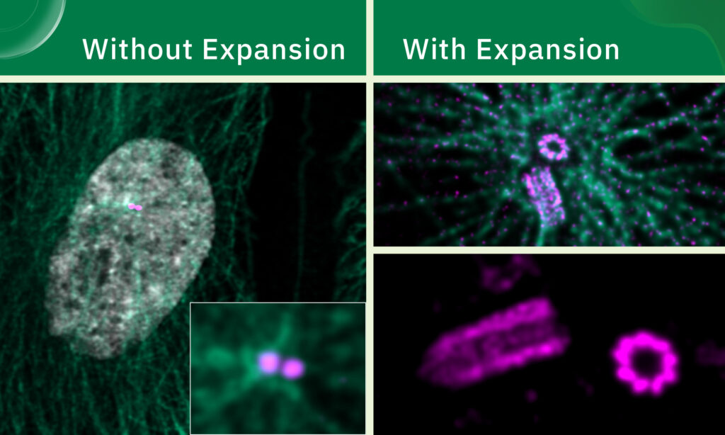 Developed 10 years ago by the group of Edward Boyden at MIT, and further optimised into ultrastructure expansion microscopy (U-ExM) for exploring sub-cellular ultrastructure by Paul Guichard and Virginie Hamel at the University of Geneva, expansion microscopy allows scientists to easily and inexpensively visualise cellular structures that are highly challenging to see with traditional microscopy techniques.