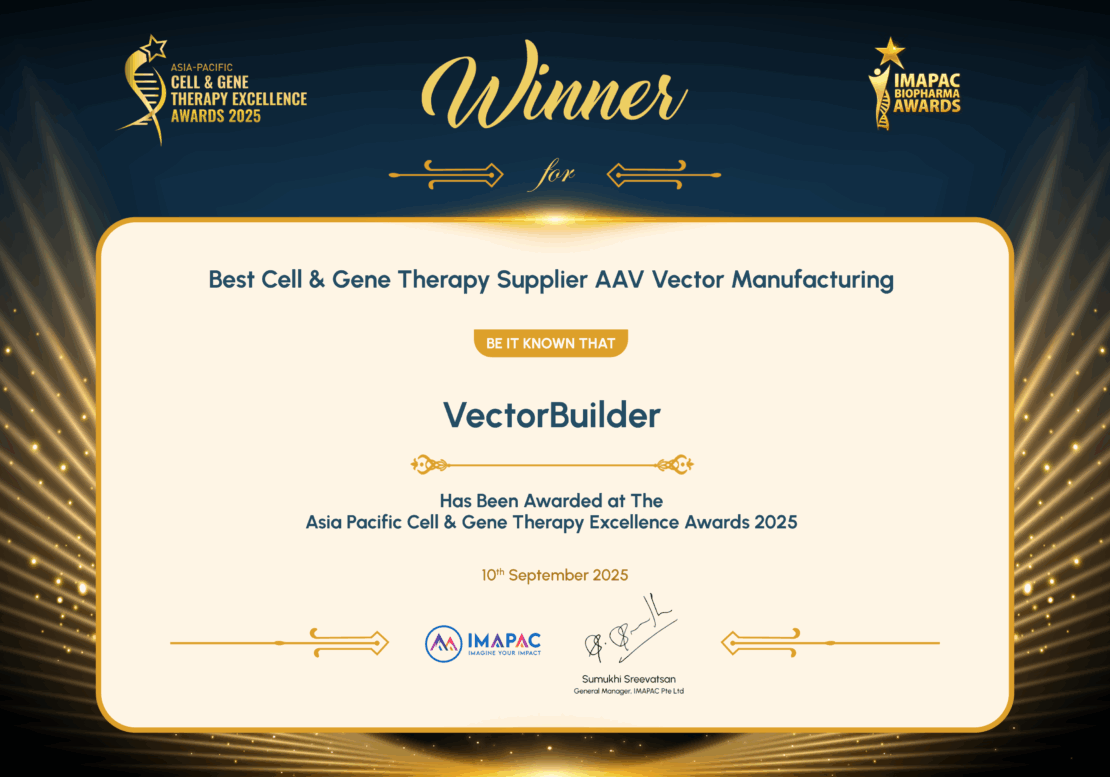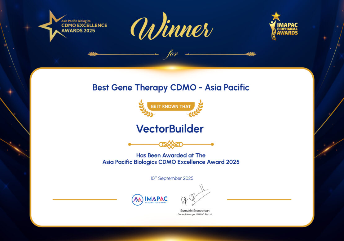 “We are honored to receive two IMAPAC awards at the same time, affirming the value of our commitment to innovation”, said Dr. Bruce Lahn, founder and Chief Scientist of VectorBuilder. “We will continue to advance gene delivery technologies and collaborate globally to enable breakthrough therapies and contribute to better human health.”